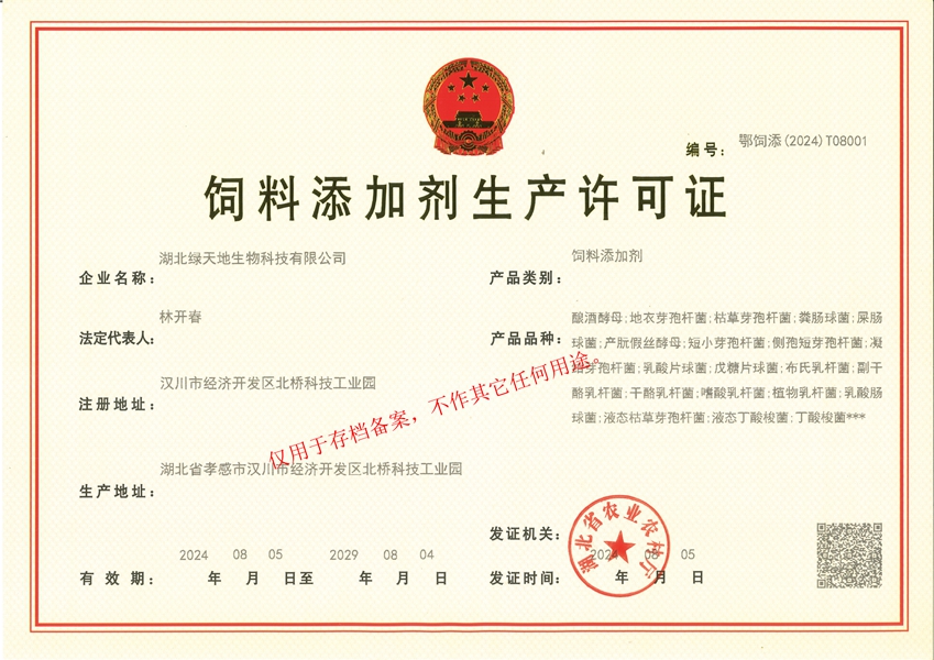 湖北綠天地生物科技有限公司 (簡稱綠天地公司)投資7000萬元,擁有25000平方米的廠房和國內先進的設備360臺套,建有微生物發(fā)酵、發(fā)酵冷凍干燥、低溫造粒等8個車間,發(fā)酵罐總容量450立方米,專業的飼用級益生菌發(fā)酵生產基地。 公司已通過IS09001:2015質量管理體系認證。 綠天地公司得到了華中農業大學、中國農...